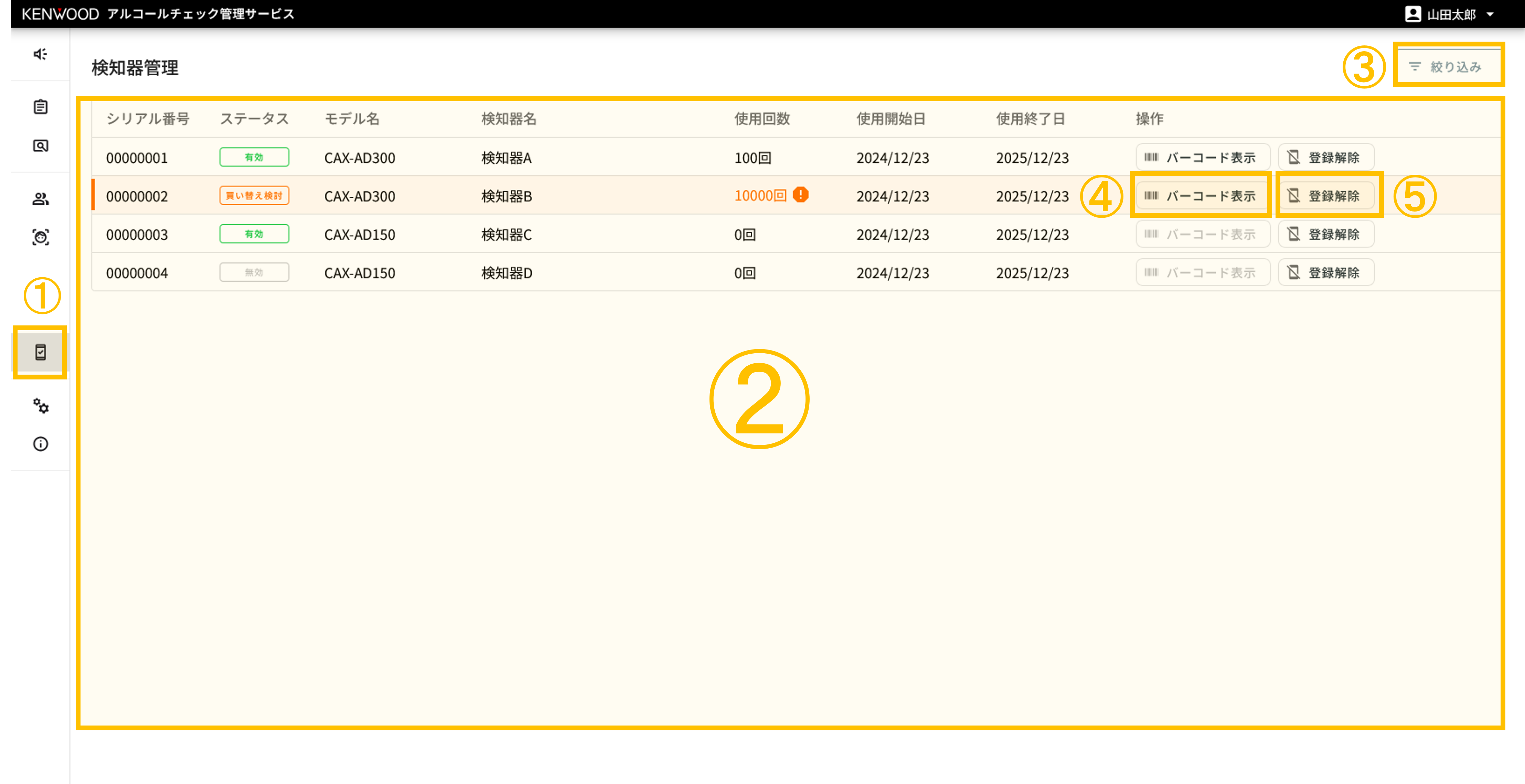 お客様が所有しているアルコール検知器の一覧を表示します。