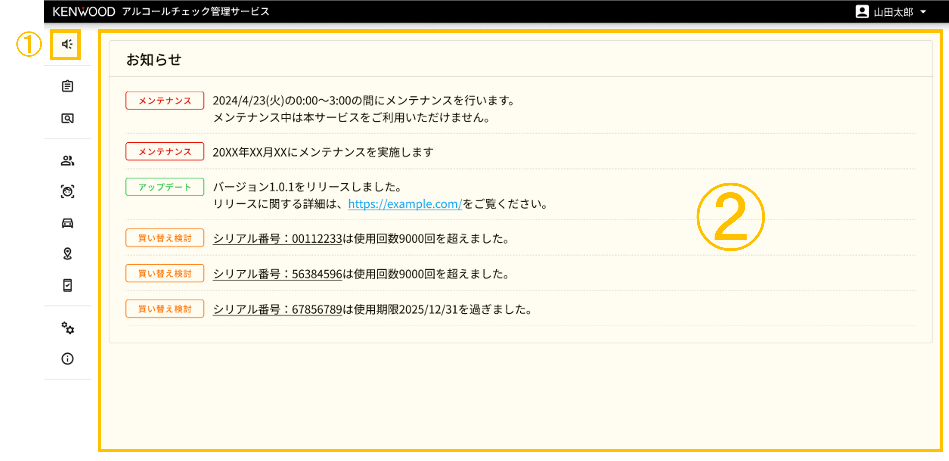 アルコール検知器のお買い換え時期や、当サービスの状況に関連するお知らせを表示します。